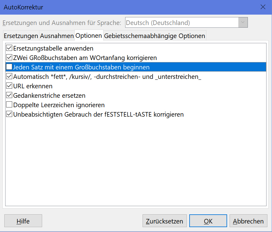LibreOffice Writer und Calc Autovervollständigung / automatische Großschreibung ausschalten